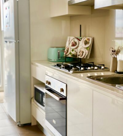 - The stylish kitchen with ultra modern stainless steel appliances and Caesar Stone bench top.
