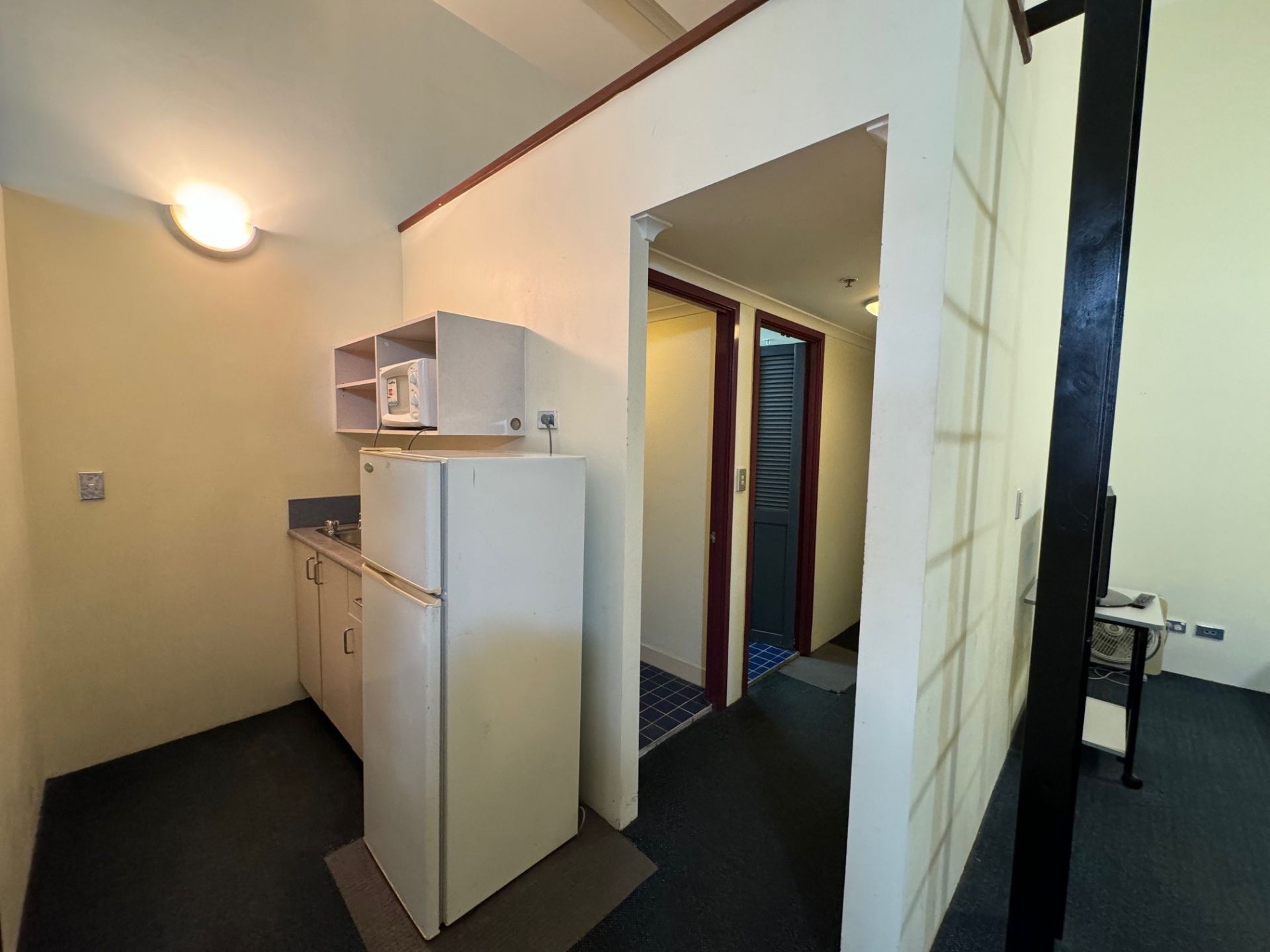 - Kitchenette with microwave, fridge and storage cupboards