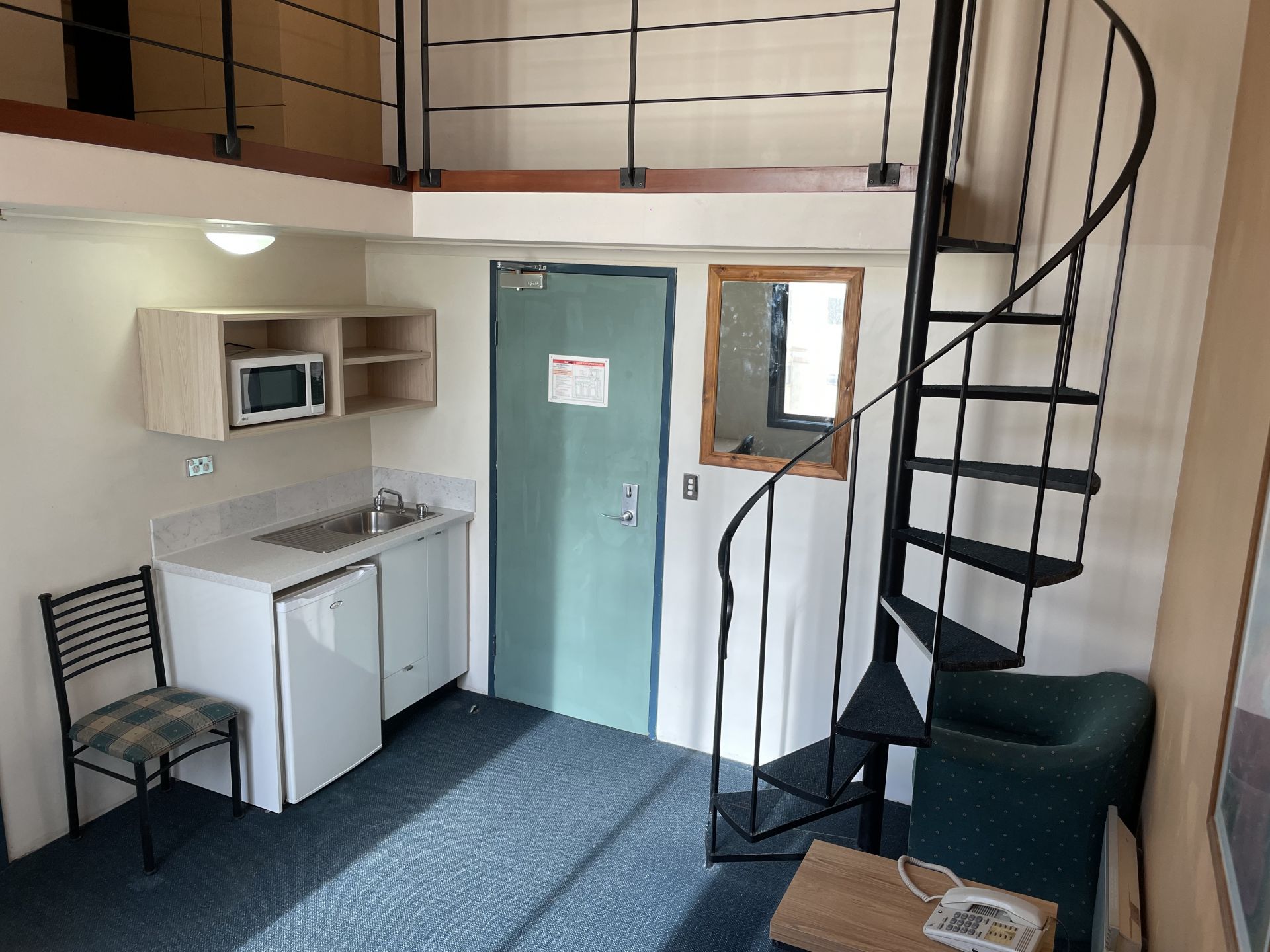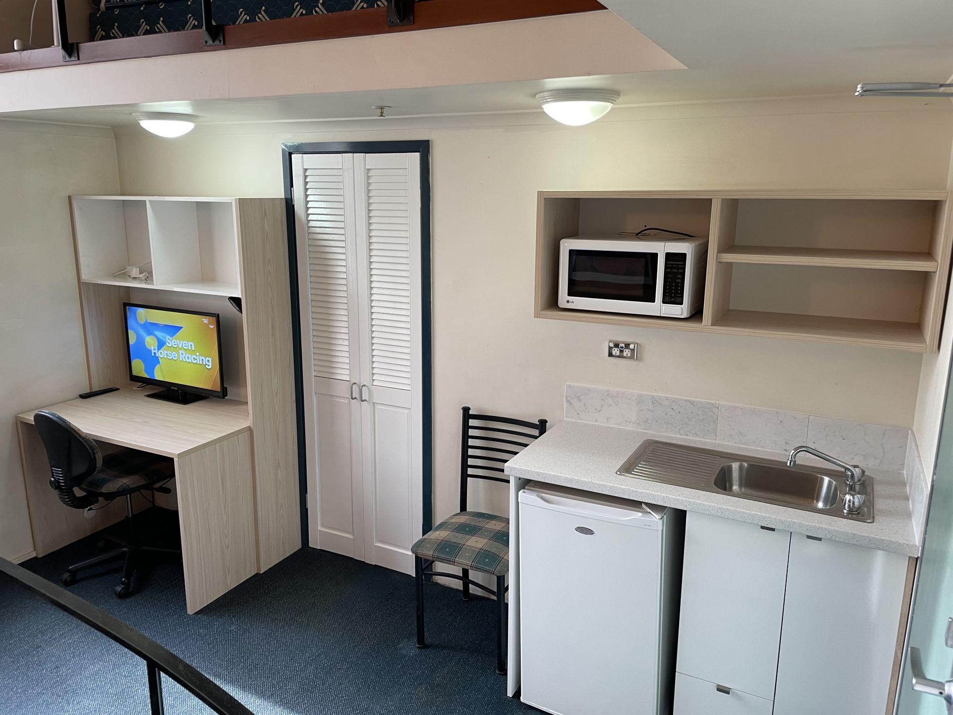 - Kitchenette equipped with microwave, fridge, and ample storage