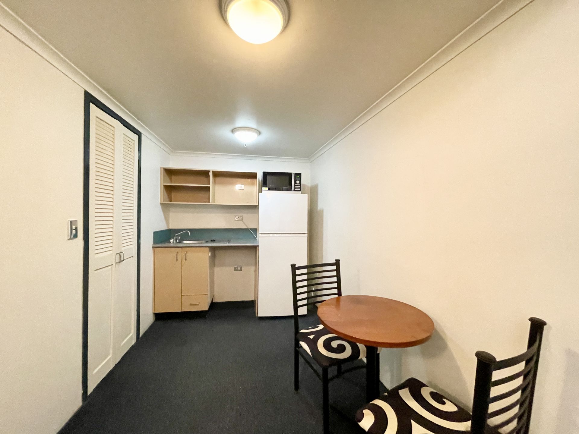 - Kitchenette with microwave, fridge and storage cupboards