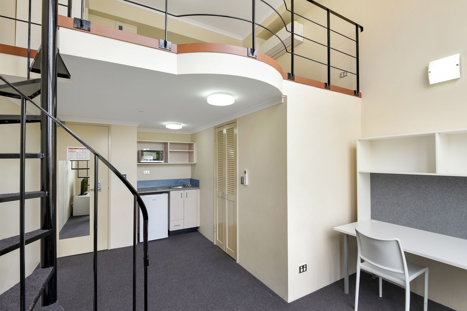 - Kitchenette with microwave, fridge and storage cupboards